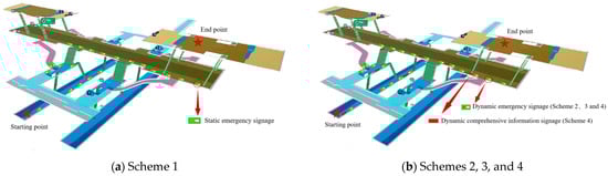 The placement of wall and ground emergency evacuation signage is the same in schemes 1, 2, 3, and 4, as shown in Figure 3. It is worth noting that the dynamic comprehensive information signage for scheme 4 is placed at the entrance of each decision area in route 1, as shown in Figure 3b. Furthermore, to enhance the experiment’s realism, virtual characters were integrated into the scenario, entering various decision-making paths in equal proportions without interacting with the participants.