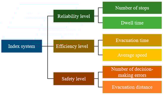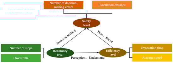 The purpose of the emergency evacuation signage system is to facilitate passengers’ swift, unobstructed, and precise identification of safe exits for evacuation. To investigate the effects of four distinct emergency evacuation signage systems on passenger pathfinding behavior under various emergency events and to identify the most effective solution, this study selected six indicators from the three dimensions of reliability, efficiency, and safety to construct an indicator evaluation system [24], as shown in Figure 4.