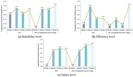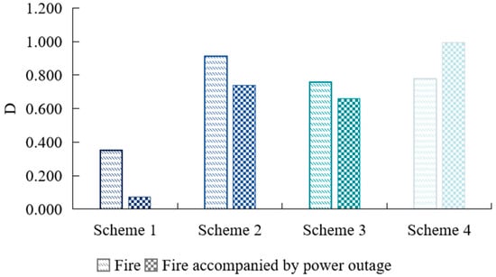 The results of Table 7 indicate that in the case of only a fire, the D value of scheme 1 is 0.350, indicating a mild imbalance. Additionally, scheme 1’s performance metrics for reliability, efficiency, and security are the lowest among the schemes, as shown in Figure 6. In contrast, scheme 2 demonstrates an excellent balance among these three levels, with a D value of 0.912, indicating an excellent coordination state. Schemes 3 and 4, however, have lower efficiency scores, resulting in D values of 0.756 and 0.778, respectively, which correspond to a moderate level of coordination.