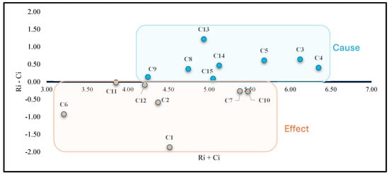 In the DEMATEL method, and are important values that help to understand how different factors in a certain system influence each other. The value of R depicts the total effect a factor influences on all other factors. The value of C indicates the total influence a factor receives from other factors. Additionally, + (prominence) shows the total involvement of a factor in the system. A high prominence indicates the factor is central to the system, whether it is affecting others or being affected. Moreover, − (relation) shows whether a factor is more of a cause or an effect in the system. If − is positive, the factor influences others more than if it is influenced (it is a net cause). On the other hand, if − is negative, the factor is influenced by others more than it influences them (it is a net effect). The analysis of these values allows us to determine which factors are most important in a system and how they interact. For the purpose of making decisions and solving problems in complex situations, this information is invaluable.
