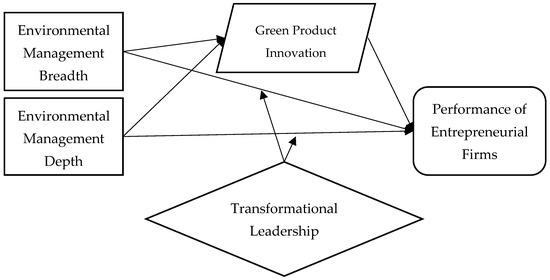 The proposed framework uses the theoretical lenses of RBV and the contingency theory, along with the support of the transformational leadership theory. The two theories were integrated to cater for the mediating role of green product innovation between environmental management and the sustainable performance of entrepreneurial firms. However, taking into consideration the inconsistencies in the literature, which integrated RBV [52] with the contingency theory [64], the synergistic influence of environmental management depth and breadth was supported with transformational leadership as a moderator for innovating green products to achieve the sustainable performance of entrepreneurial firms.