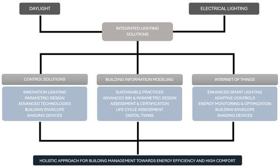 This section presents the role of integrated lighting control, Building Information Modelling (BIM), and the Internet of Things (IoT). Firstly, we will explore the territory of integrated lighting control, in which innovations in lighting and daylight optimisation maximise energy efficiency. Secondly, BIM’s role in sustainable building practices and retrofitting buildings will examine retrofitting or optimisation strategies, highlighting advanced methods and the integration of parametric design to enhance energy efficiency. Thirdly, IoT smart building technologies will be investigated, with a particular focus on intelligent lighting and adaptive controls, discussing the synergy with BIM energy monitoring, which maximises energy efficiency. The current study focuses on optimising the building envelope and shading systems involving kinetic facades, adaptive shading, and photovoltaic solutions, among other things.