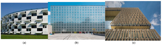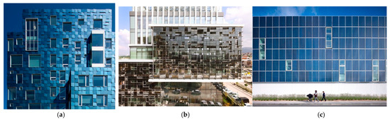 Some representatives built projects with photovoltaic energy-generating facades. (a) Copenhagen International School, Copenhagen (DK), Project of C.F. Møller, 2017. (b) EWE and Bursagaz Headquarters, Bursa (TR), Project of Tago Architects, 2016. (c) Green Dot Animo Leadership High School, Los Angeles (USA), Project of Brooks + Scarpa Architects, 2013.