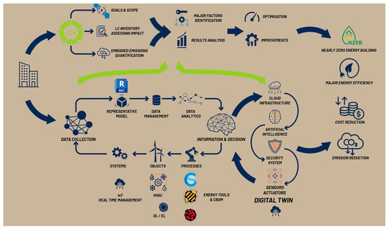 A digital twin is a copy of a physical building, system or process, and its development has been made possible since BIM was merged with the Internet of Things platforms by offering real-time data collection and monitoring processes. Decision-making capacity is elevated by employing modelling and interaction with digital models in the real world, enabling stakeholders to see and interact with the digital model in real time, showcasing changes and updates from the physical environment. Nowadays, BIM is widely used in architectural and engineering practices as an innovative technology that can manage various and multiple tasks, allowing for more effective management, planning, and design of buildings [19]. As society continues to face the pressing issue of the environmental impact and the threat of global warming, it has become increasingly necessary to integrate BIM with building energy performance. In addition, optimising the resources would allow us to tackle the bad habits of the construction companies responsible for 37% of all energy-related CO2 emissions, according to the UN Environment Program [20]. To achieve this goal, BIM must be used to evaluate energy during the initial design phase by linking the structure of future buildings and existing ones to energy analysis tools. Only then will the idea of green BIM be predominant in all practices, as BIM and green buildings are the two essential factors that make it possible.