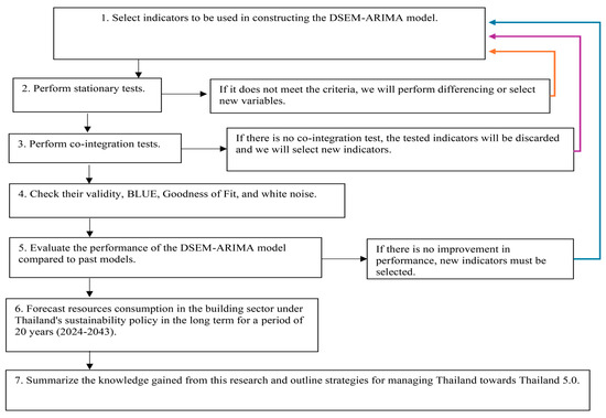 Figure 1 illustrates the research steps of the DSEM-ARIMA model to study the influence of causal factors affecting the efficiency of resource consumption in the construction under sustainability policy in Thailand. The research procedure can be summarized as follows: