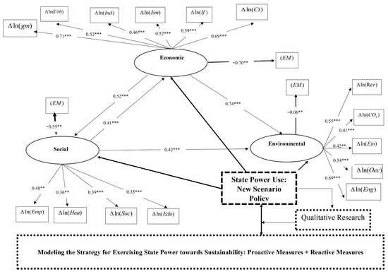 - This analysis shows that government policy has the most direct influence on the environmental sector, at 61%, with a significant level of 1%. This indicates that a 1% change in political impact leads to a 61% change in the environmental sector in the same direction. Following this, government policy also has a direct influence on the economic sector, accounting for 50% of the total, with a significant level of 1%. This signifies that a 1% change in policy leads to a 50% change in the economic sector in the same direction. Additionally, government policy directly influences the social sector, amounting to 35% with a significant level of 1%. This indicates that a 1% change in policy leads to a 35% change in the social sector in the same direction;