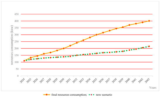 For this research, a new scenario policy was established in the DSEM-ARIMA model. The forecasting results of resource consumption in construction for the next 20 years, from 2024 to 2043, are illustrated in Figure 4.