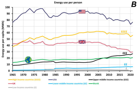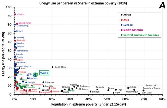 Figure 3A,B illustrate the extent to which living standards and energy use are correlated. Countries with high levels of extreme poverty consume less energy per capita, with similar metrics such as energy use per capita versus the Human Development Index showing similar stark trends [20]. As countries and their citizens become wealthier, energy consumption rises sharply.