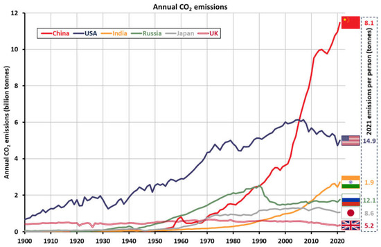 Annual CO2 emissions for the UK and other selected countries. Data from Global Carbon Budget; available from [36].