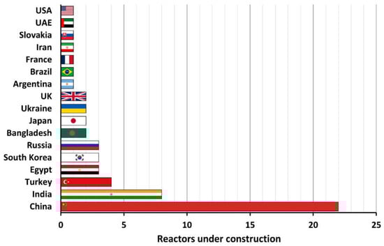 Figure 5 is a stark reminder of just how big the international challenge of decarbonisation is; in absolute terms, the UK currently emits less than 5% of the CO2 of China (while absolute amounts of CO2 emitted is the discussion here, it should be noted that the UK’s population is slightly less than 5% that of China, so national emissions per person are similar). Based on their current strategy of continued expansion of coal capacity [35] and the trajectory in Figure 5, this is unlikely to reduce emissions in the near future. On the other hand, China’s rapid industrialisation has taken place alongside a considerable investment in nuclear energy, and almost 40% of all reactors being constructed worldwide are in China, compared with only four (7%) in Europe and the USA (Figure 6). China is also merely the frontrunner of many countries around the world that are rapidly developing, and emissions from other countries will inevitably follow suit. India’s emissions are also shown in Figure 5 and display a similar rate of increase to that demonstrated by China merely a couple of decades ago; India and China both have populations of 1.4 billion people, and it is realistic to assume India will aspire to similar industrial output to China in the years to come. Whilst China has pledged to achieve carbon neutrality by 2060 and India by 2070 (both countries also have 2030 targets: China to produce 50% of its electricity from non-fossil sources and India to have achieved peak CO2 emissions), the curves in Figure 5 exemplify the importance of deploying any and all technologies that can flatten or decrease total annual carbon emissions whilst still enabling economic growth in developing countries.