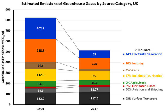 The other goal with the most relevance to the energy sector is Goal 13: “Take urgent action to combat climate change and its impacts”. This goal has eight indicators concerning national disasters, the extent to which “global citizenship” and “sustainable development” education are present in national education policies, contributions to the “Green Climate Fund”, and “total greenhouse gas emissions per year” (Indicator 13.2.2) (pp. 24–26, [9]). With its commitment to achieving net zero emissions by 2050 (Para. 1 in [25]), Indicator 13.2.2 is the UK’s most relevant indicator from this SDG and is reflected in the 2008 Climate Change Act (the target was amended in 2019 to 100% emissions reduction) [25] (See Section 6, Key Point 2).