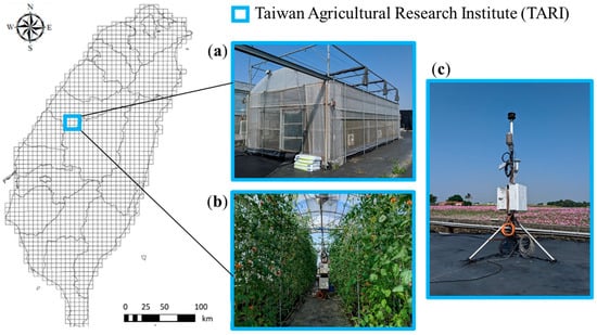 Illustration of the study area located in the Taiwan Agricultural Research Institute (TARI) in Central Taiwan. (a) TARI greenhouse. (b) Tomato cultivation. (c) Outdoor weather monitoring station.