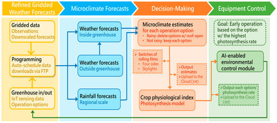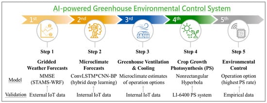 This study introduces an AI-powered greenhouse environmental control system (AI-GECS) that integrates customized gridded weather forecasts, AI-based microclimate forecasts, a crop physiological indicator, and greenhouse operation strategies (Figure 2).