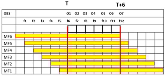 Conceptual illustration of the time-delay method for multi-model super-ensemble forecasting. MF1-MF6 denote six forecast models.