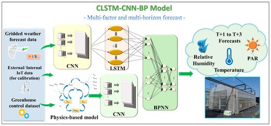 In this framework, the greenhouse control dataset is utilized as input for a physics-based model to simulate internal greenhouse temperatures. The study develops the CLSTM-CNN-BP model, which integrates two deep neural networks: the Convolutional Long Short-Term Memory (CLSTM) network and the Convolutional Neural Network (CNN), alongside a regression Backpropagation Neural Network (BPNN). This hybrid model forecasts three microclimate variables that significantly affect crop growth, including Temp, RH, and PAR (Figure 4). By leveraging advanced deep learning techniques, the CLSTM-CNN-BP model efficiently extracts essential features from high-dimensional data, significantly improving forecast accuracy and reliability.