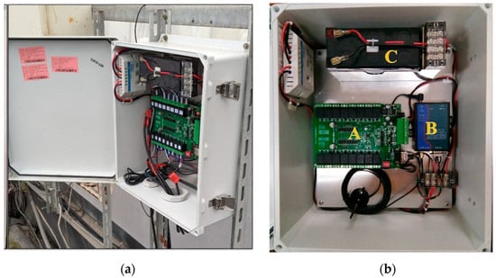 AI-enabled environmental control module. (a) Module size: 39 cm × 34 cm × 17.5 cm. (b) A: Relay control board; B: network sub-module; and C: backup battery (12 V).