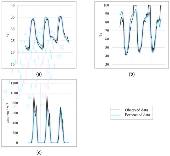 The model also shows commendable performance in forecasting PAR, adequately capturing peak values. High R2 values (0.84) are observed between the forecasted and actual data, as illustrated in Figure 8c. Despite this, the forecast errors for PAR are relatively substantial (RMSE = 112.9 μmol•m−2•s−1) compared to the mean values in the observed dataset (97.39 μmol•m−2•s−1).