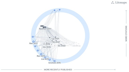 To comprehensively analyze studies related to YOLO models, we employed the literature review software Litmaps (https://www.litmaps.com) to identify and address gaps in existing research. Our analysis included 1541 scientific papers sourced from the Scopus database. Based on this dataset, we created a graph analyzing literature sources related to YOLO models generated by the Litmaps tool, presented in Figure 1.