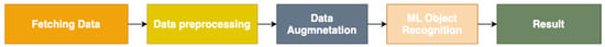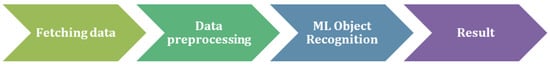 The process for recognizing objects, like detecting potholes on roads, generally follows a systematic image-handling pipeline []. This pipeline can be divided into four main steps: data fetching, data preprocessing, machine learning for object recognition, and results generation. Below is a detailed description of each step (see Figure 2):