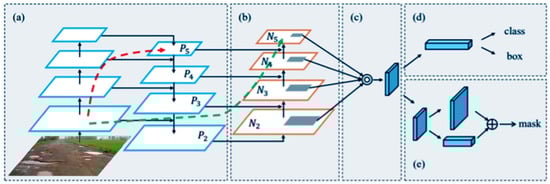 This is an illustration of the framework. (a) FPN backbone, (b) bottom-up path augmentation, (c) adaptive feature pooling, (d) box branch, (e) fully-connected fusion.