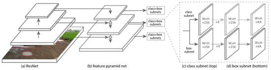 A key enhancement in our approach is the integration of a novel neural network architecture that combines both the feature pyramid networks (FPNs) (Figure 5) and path aggregation network (PANs). This architecture enables efficient feature capture across multiple scales and resolutions, which is essential for detecting objects of varying sizes and shapes []. Specifically, the FPN component in YOLOv8 gradually reduces the spatial resolution of the input image while increasing the feature channel count, producing feature maps that support object detection across a broad range of scales. Meanwhile, the PAN architecture complements this by aggregating features from different network levels through skip connections, enhancing the model’s capacity to capture intricate details.