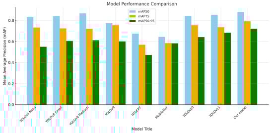 Comparison of model performance: (blue) Based on mean average precision IoU 50; (orange) mean average precision IoU 75; (green) mean average precision IoU 50–95.