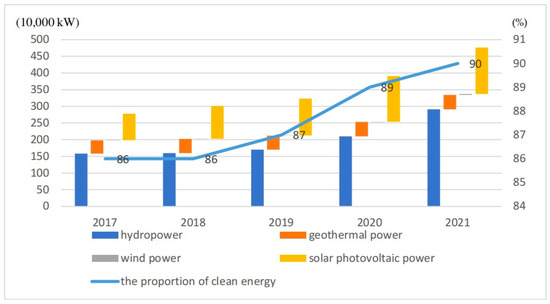 The Tibet Autonomous Region has initially established a hydropower-based, multi-energy energy supply system. The Tibet Autonomous Region is located on the southwestern border of China, with an area of 1.2 million km2, accounting for about 1/8 of the whole country’s area. At present, the Tibet Autonomous Region has formed two independent power grids, the Tibet Power Grid and Ali, as well as a number of independent mini-grids and decentralized household systems supplied by small hydropower stations in rural areas and by solar photovoltaic power stations, constituting a power supply pattern combining power from the large grid with power from decentralized independent power sources and complementing the power supply system with a variety of sources of energy. Figure 1 below shows the electric power generation capacity and aggregate proportion of various clean energy sources in Tibet.