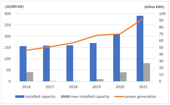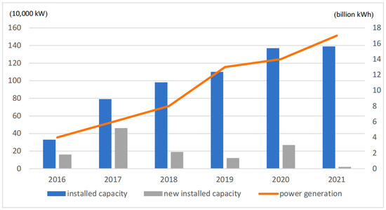 Over the past 30 years of introduction, research, development, testing, demonstration, and promotion, the Tibet Autonomous Region has initially established a new situation in solar energy utilization, with large-scale grid-connected photovoltaic power plants as the mainstay, complemented by various types of independent photovoltaic, distributed grid-connected photovoltaic power plants, small household photovoltaic systems, and wind–solar hybrid power stations. More than 400 photovoltaic power stations of various types have been built and put into use, with over 200,000 household solar photovoltaic systems being adopted. Among them, the installed capacity and quantity of independently operated photovoltaic power stations rank first in the country, benefiting more than 600,000 farmers and herders. In the first quarter of 2022, Tibet accumulated a total of 440 million kWh of photovoltaic power generation, accounting for 20.4% of the region’s total power generation. Installed capacity and power generation in Tibet from 2016 to 2021 is displayed in the following Figure 5.