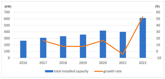 In recent years, Tibet has increased its investment in clean energy electricity, effectively utilizing its abundant water resources and ample sunshine resources by constructing large-scale hydropower stations and solar power plants to convert these clean energy sources into reliable electricity supply. To ensure the access and supply of clean energy, Tibet has also strengthened its grid construction. By building new and upgrading existing power transmission lines and substations, not only has the transmission capacity and stability of electricity been improved, but the conditions for accessing clean energy have also been enhanced. In 2021, the total transformer capacity of 110 kV and above power grids in the autonomous region reached 19.48 million kVA, with a total line length of 20,000 km. Under the direct drive of the “Power Transmission Sky Road”, Tibet’s power grid load has continuously broken historical records year after year, with an average annual growth rate of 15.52%, reaching a peak of 1.91 million kW. The total installed capacity and growth rate of power in Tibet from 2016 to 2022 are presented in Figure 6. The total social electricity consumption has maintained double-digit growth for consecutive years. In addition, to simply developing clean energy, Tibet actively promotes the coordinated development of clean energy with other forms of energy. Guided by energy policies, Tibet vigorously develops the coordinated utilization of renewable energy and traditional energy, forming a diversified energy supply system. For example, while constructing hydroelectric power stations, Tibet fully utilizes the energy storage characteristics of hydroelectric stations to achieve energy complementarity and balance through the combined use of wind power or solar power generation. This coordinated development not only improves energy utilization efficiency but also addresses the issue of unstable energy supply caused by factors such as seasonality and climate.