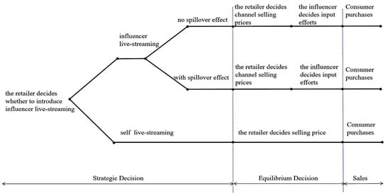 We examined three different digital supply chain structures, assuming that the retailer initially marketed through self-live-streaming. It is now possible for the retailer to introduce another sales channel: the influencer live-streaming channel. Consumers are assumed to be able to purchase one unit of goods at a time through a single channel. Influencer popularity promotes brand exposure, leading consumers to pay attention, understand, and purchase. This effect is commonly referred to as a positive spillover effect in inclusive marketing and business performance. The positive spillover effect makes consumers more willing to buy, increasing demand for the self-live-streaming channel. On the contrary, influencers may also fail to generate significant spillovers for a variety of reasons. It may even create competition between digital channels. The decision sequence is depicted in Figure 1.