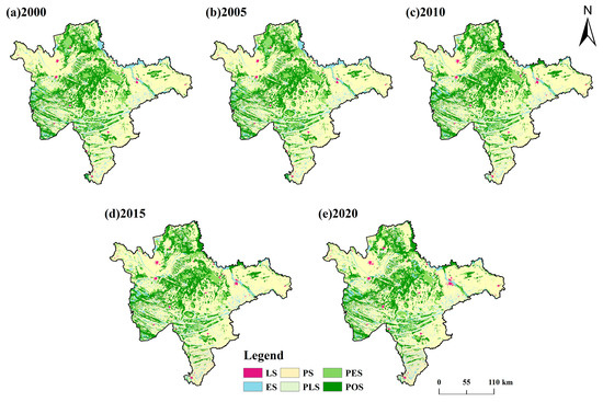 The PLES in the WJL exhibit a distinct hierarchical structure (Figure 3). PS is widely distributed and predominates. At the same time, ES is primarily concentrated in the northern part, extending in an east–west direction. POS and PES are mixed in distribution across the central, northwestern, and southwestern areas, whereas the extent of LS and PLS is relatively limited.