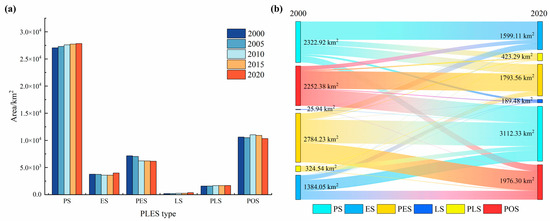 Spatiotemporal distribution of ecological zones (a) and visualization of changes in the area of each ecological zone in PLES (b).