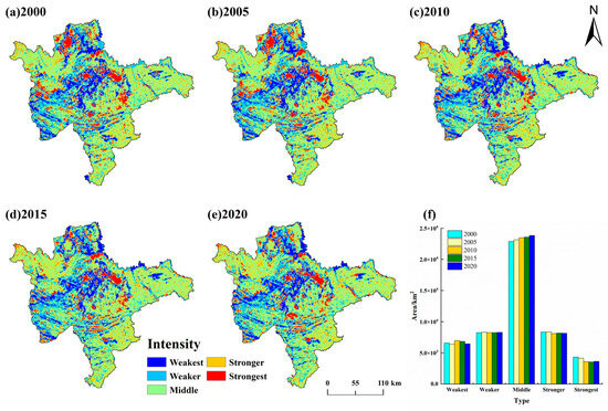 The “moderate” intensity zone dominates in the study area, accounting for approximately 46%, indicating a relative balance between resource development and environmental protection. The area of “weakest” intensity zones increased from 6574.23 km2 at the beginning of the study to 6955.50 km2 in 2010, reflecting an increase of 381.28 km2; however, by 2020, it decreased to 6450.07 km2, representing a reduction of 505.43 km2. In contrast, the “weaker” and “strongest” intensity zones exhibited similar trends, increasing from 2000 to 2005. By 2020, the area of “weaker” intensity zones had risen by 48.23 km2 compared to in 2000, whereas the “stronger” intensity zones had decreased by 682.89 km2. Furthermore, from 2000 to 2005, the area of “stronger” intensity zones expanded but subsequently began to decline, resulting in a cumulative decrease of 193.83 km2 compared to 2000 (Figure 5f).