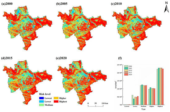 2000–2020, the “lowest” risk areas exhibited a gradually increasing trend, while the “lower” risk areas demonstrated a pattern of initial reduction followed by an increase. Specifically, between 2000 and 2005, the “lower” risk areas decreased by 2281.99 km2. From 2005 to 2020, the “lower” risk zone area increased to 5353.75 km2. Concurrently, from 2000 to 2005, the “medium” and “higher” risk areas increased by 490.66 km2 and 1036.71 km2, respectively. After 2005, both risk categories experienced a slight reduction, though the changes were minimal. The “highest” risk areas increased from 22,260.95 km2 to 23,018.60 km2 during the 2000–2005 period, reflecting an increase of 757.65 km2, but after that, until 2015, their area remained relatively stable, decreasing by 588.69 km2 by 2020. This change indicates a reduction in the areas of both “highest” and “higher” risk zones, suggesting an overall weakening of LER (Figure 6f).