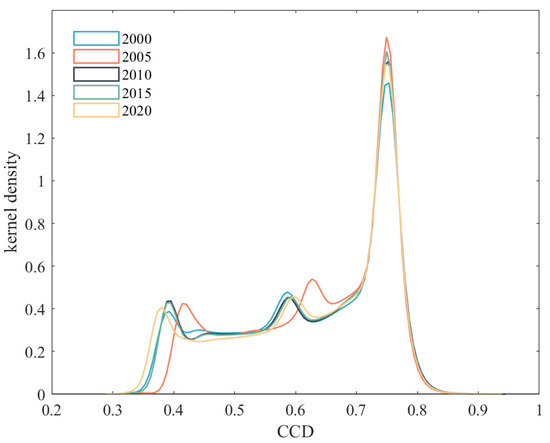 The kernel density estimation results indicate that from 2000 to 2020, the CCD of LUI-LER in WLJ gradually increased (Figure 7). Specifically, the center of gravity of the kernel density curve progressively shifted to the right, with the peak of the curve rising and becoming more pronounced. Additionally, the triple-peak phenomenon observed in the kernel density curve reveals a polarization characteristic of the CCD. Examining the extent of the kernel density curve, it is evident that the left tail is significantly elongated, while changes on the right side are relatively minor. This suggests a catching-up effect in the areas with low coupling coordination, whereas the growth in high coupling coordination areas is slower.