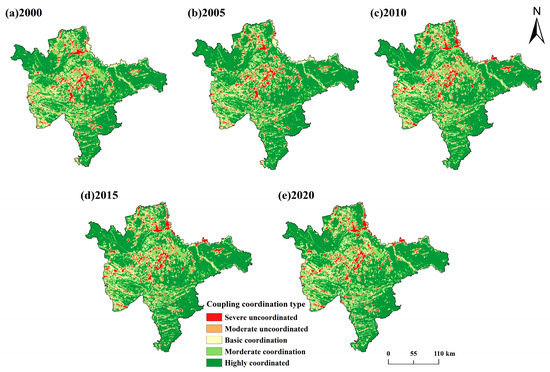 In the formula, LUER represents the dynamic distribution of the coupling level between LUI and LER from 2000 to 2020. Meanwhile, , , , , and correspond to the codes for the coupling levels of LUI and LER for the years 2000, 2005, 2010, 2015, and 2020, respectively.