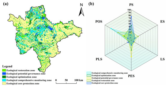 The ECP zone, which requires stringent conservation due to its high production value, accounts for 61.63% of the total area and exhibits the most extensive distribution in the PS zone. This area provides critical ecosystem services and is highly sensitive to ecological protection measures. The ECM zone, located primarily in the central and western parts of the study area, covers 11.24% of the total area and is the most prominent in the POS zone. This region requires ongoing monitoring and management to maintain ecological stability and promote sustainable development. The EO zone, found in the central, northwestern, and southwestern regions, covers 10.18% of the total area and has the broadest coverage in the POS zone. Although its ecological environment is gradually improving, further optimization is needed. With appropriate land use planning and management, its ecological service functions can be enhanced. The ER zone, concentrated in the central, northwestern, and southeastern regions, occupies 10.31% of the total area, with the largest coverage in the PS zone. Due to anthropogenic degradation, this area urgently requires restoration efforts to recover its ecological functions. The EPG zone, primarily located in the central and northwestern regions, covers 6.64% of the total area and is the most widely distributed in the PES zone. While its ecological condition is currently stable, potential environmental risks persist, necessitating early intervention and governance strategies.