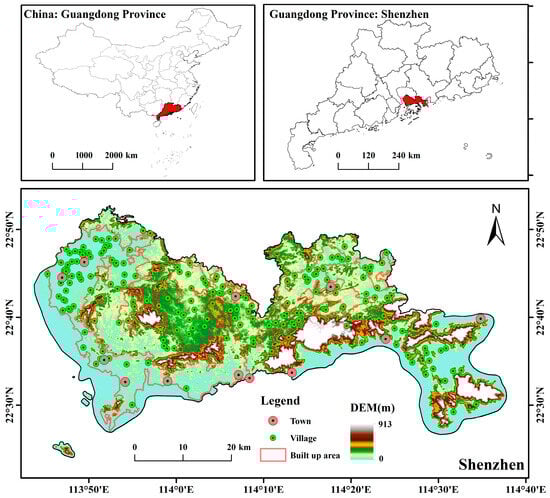 Shenzhen, situated in the southern coastal region of Guangdong Province, China, is located just south of the Tropic of Cancer, between 113°43′ to 114°38′ E longitude and 22°24′ to 22°52′ N latitude (Figure 1). Shenzhen covers an area of 1997.47 square kilometers, has a subtropical monsoon climate, and is notable for its rich biodiversity. According to partial data from the 2015 Shenzhen Biodiversity Conservation Plan, the city contains 2229 vascular plant species and 509 terrestrial wildlife species, including 31 amphibian, 76 reptile, and 36 mammal species [43]. However, the most recent Shenzhen Biodiversity Conservation Action Plan (2020–2025) shows a decline in vascular plant species to 2086, with amphibians reduced to 22 species and reptiles to 61 [43,44]. The incomplete nature of earlier biodiversity surveys has highlighted the growing risk of biodiversity loss in Shenzhen as a matter of significant concern.