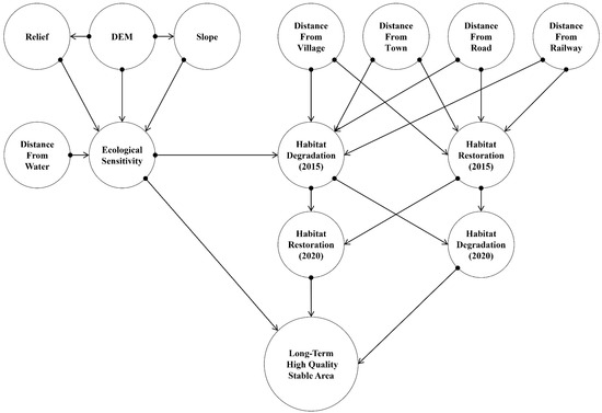Advances in 3S technologies (Geographic Information Systems, Remote Sensing, and Global Navigation Satellite Systems) enable the quantitative and visual analysis of LUCC and habitat changes over time and space. This facilitates large-scale biodiversity assessments [24,25]. In recent years, habitat quality research has increasingly utilized multi-scale and multi-dimensional models. These models have been continuously updated and improved. Commonly used models include the maximum entropy model (MAXENT), which predicts species distribution based on ecological niche theory [26,27]. The habitat suitability index (HSI) assesses habitat selection and limiting factors [28]. The InVEST model integrates habitat quality and ecosystem services, providing a comprehensive evaluation. The biodiversity assessment module in IDRISI software [29], Social Values for Ecosystem Services (SolVES) [30], and InVEST [31,32] have all been widely employed for habitat quality assessments. Among these models, InVEST is particularly favored. It assesses habitat quality by combining habitat suitability with anthropogenic pressure factors [9]. Habitat suitability refers to the capacity of a land unit to support species, which is determined by land cover type, vegetation, and other landscape characteristics that influence the ecological needs of species. Anthropogenic pressures, such as urbanization and agriculture [31,33], are typically quantified by different levels of human development, such as urban, suburban, and rural areas. This makes InVEST effective for large-scale biodiversity and land use change studies. It can even be used with limited species data. However, InVEST has some limitations. It cannot fully capture the dynamic processes of habitat degradation and restoration. Additionally, it struggles with modeling the deeper evolutionary aspects of habitat changes. In contrast, MAXENT excels in species-specific studies but requires extensive species data. Both models struggle with causal analysis and the complex interactions between ecological variables. Therefore, additional tools are needed to provide a more comprehensive understanding. Despite these limitations, integrating multiple models remains an area for further research. Habitat restoration is a key strategy for mitigating habitat degradation [34]. It involves more than just land cover conversion; it is a process where degraded habitats evolve toward improved conditions [35]. Temporal dimensions, such as patch characteristics and influencing factors, should be considered in habitat quality evolution studies. Bayesian Networks (BNs) offer a potential solution. BNs can capture spatial–temporal relationships and causal factors in habitat change.