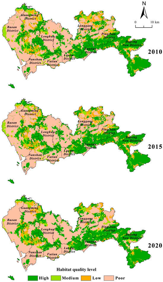 Spatial distribution of habitat quality in Shenzhen from 2010 to 2020.