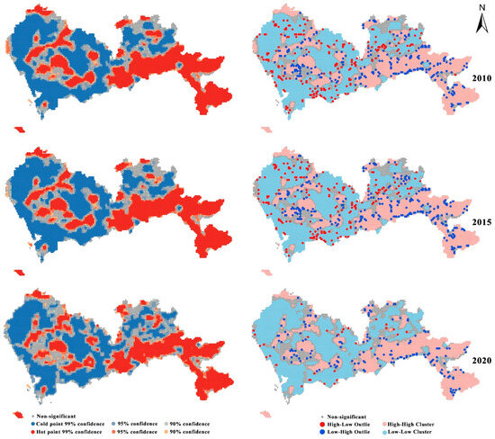 The results of the spatial autocorrelation analysis (Figure 4, Table 5) indicate that Global Moran’s I for habitat quality exhibited positive correlation over the decade, with the index increasing by 0.02 between the two periods. This indicates a strong and increasing trend toward spatial clustering. While the clustering index for habitat quality fluctuated, it generally trended upward. The high–high clustering index decreased by 2.83%, while the low–low clustering index increased by 6.13%, contributing to an overall clustering index rise of 3.3%. These changes suggest intensified spatial clustering, particularly in low-quality (cold-spot) areas. Furthermore, the proportion of high–low outliers dropped significantly, indicating the near disappearance of high-quality habitat areas within and around built-up zones. While the proportion of low–high outliers decreased slightly, it remained at a stable level, implying that ecological protection measures have had some mitigating effects on factors negatively impacting habitat quality in natural areas.