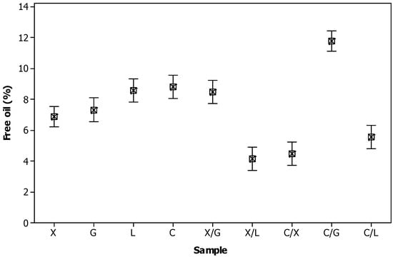 Free oil of PWC samples expressed as a percentage (w/w) in the sample (X: xanthan gum, G: guar gum, L: LBG, C: κ-carrageenan). Interval bars denote the pooled standard deviation (mean of three replications and 95% confidence level).