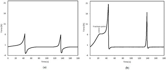 Typical texture profile analysis curves (80% deformation, 20 mm/min compression speed) of PWC: (a) sample X (without fracture point) and (b) sample C (with fracture point). The two consecutive cycles of compression–decompression are shown.