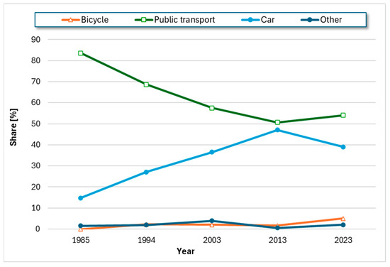 Modal split in non-pedestrian urban passenger travel in Kraków from 1985 to 2023, based on references [26,27].