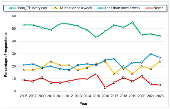 Results of annual surveys on public transport (PT) usage (excluding rail) by residents of Warsaw, based on reference [30].