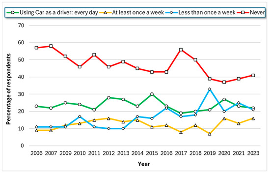 Figure 3 illustrates the stable proportion of respondents who use cars every day as drivers. The overall increase in car traffic can be attributed to the rise in the share of individuals reporting less-frequent car use and a significant decline in the proportion of individuals who reported never using cars as drivers.