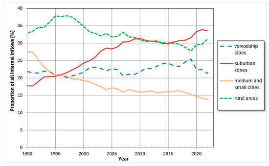 In planning sustainable development of the transport system in Polish cities, the road system was expected to implement measures such as establishing a functional hierarchy of the road network, developing bypass routes linked to external road networks relative to the city, limiting the traffic functions and technical standards of streets in urban centers, and eliminating so-called “bottlenecks” and gaps within the road network. A primary task was to systematically manage traffic [31]. This was particularly crucial due to the dynamically increasing motorization (see Table 3).
