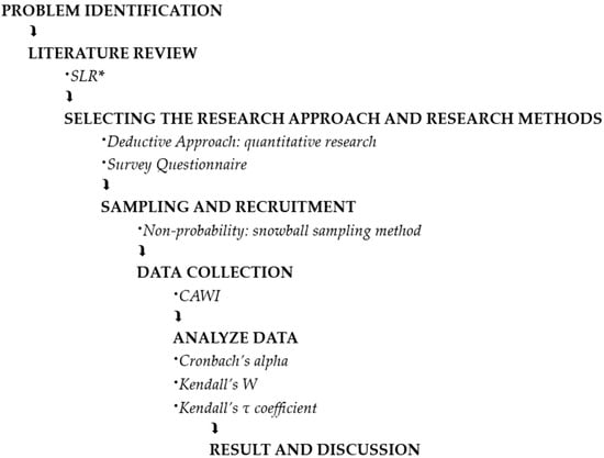 A systematic review of the literature has made it possible to identify the fourteen factors studied so far that positively influence the engagement of remote workers (key steps in the research process: Figure 2). To achieve the intended purpose of this study and compare their importance for employees working in different models (e.g., 100% remote work, hybrid work, working in different time zones, etc.), a questionnaire was developed based on the identified factors (see below). The questionnaire consisted of 14 questions and a personal data sheet. Respondents were asked to assess how important the following are for work engagement in the case of remote working: