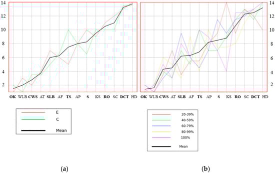 As mentioned before, the consistency of the rankings within the distinguished groups was assessed using Kendall’s W coefficient. The obtained coefficients ranged from 0.744 to 0.948. The results are statistically significant (p < 0.0001). The demonstrated strong agreement between the ratings in the individual groups does not mean, however, a total lack of interesting differences. To an even greater extent, when assessing the correlation between the rankings of various groups for employees working remotely 20–39% and the group of employees working fully remotely, no agreement was found (W = 0.262, p < 0.05). Hence, it is worth comparing the hierarchy structure, especially with respect to these two groups of employees.