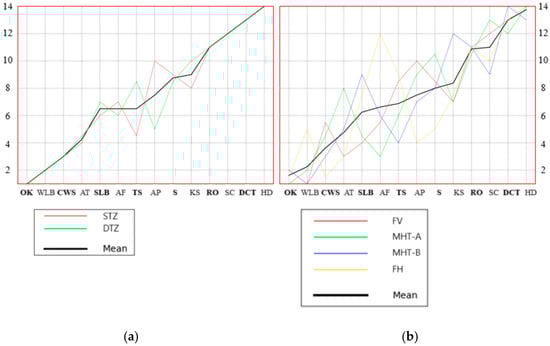 Interesting differences emerged when taking into account the type of team in which the respondents worked (Table 5/Figure 4b) among the factors in the top three; it was noticeable that OK (open access to the organization’s knowledge), which in the case of other respondents ranked first or (less often) second, was assessed as less important by people working in Full Virtual Teams (FVT) and was ranked fifth. Similarly, CWS (comfortable, customized workspace) is usually positioned very high; people working in Full Hybrid Teams (FHT) assessed it below rank 5 (tied rank: 5.5). AT (autonomy to choose where to perform tasks) ranked between third and eighth, and it was more important for Full Hybrid Teams (FHT) and Full Virtual Teams (FVT) and less important for Mixed Hybrid Team—Type “A” (MHT-A) and Mixed Hybrid Team—Type “B” (MHT-B). However, the greatest discrepancy in the structure of the hierarchy concerned the establishment of positions in the hierarchy structure for TS.